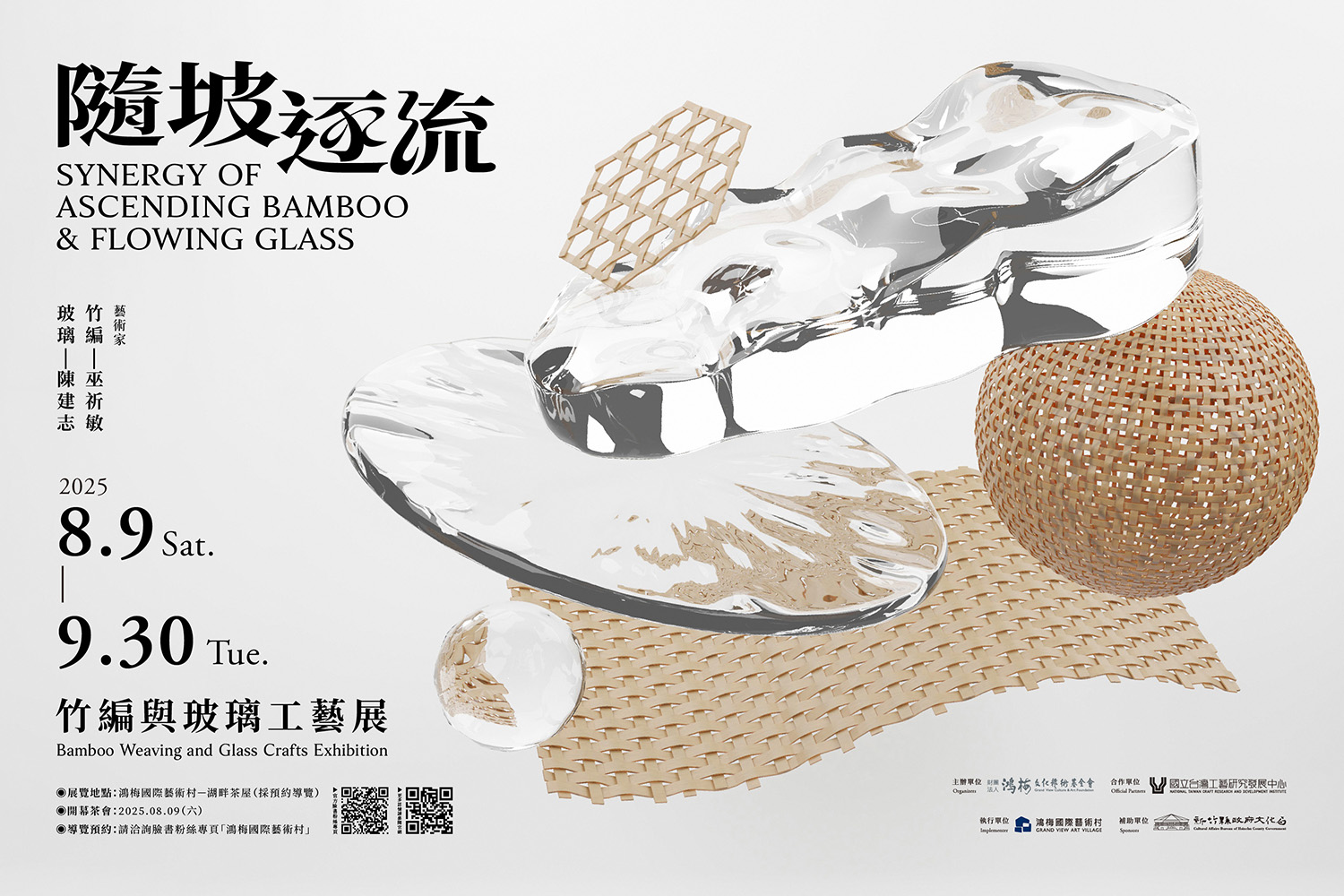 「隨坡逐流」透過竹與玻璃展現新竹自然之美與材料特性。「隨坡」,如竹之韌性,順應地形生長;「逐流」,如玻璃熔融,凝聚光影之美。兩者的交融,體現剛柔並濟的創作哲學,反映工藝家對自然與材料的探索。展覽有三大主題:「竹影隨坡」展現竹編工藝的柔韌之美,「玻影逐流」聚焦玻璃回收與再造,重新詮釋材料價値,「剛柔共融」呈現竹與玻璃的創意結合,激發意想不到的藝術張力,並藉由探索自然、人文與工藝的交融,體會新竹在地工藝的創新與永續精神。