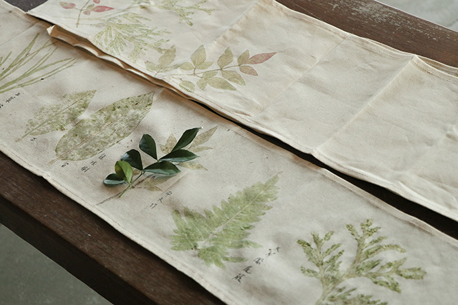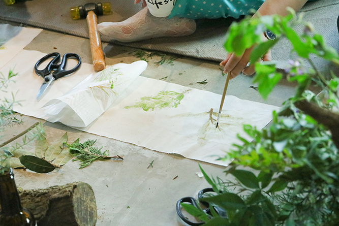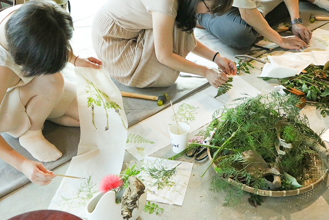 在創作過程中,Steven老師細膩地回應每一位學員的作品,傾聽創作當下的情緒與故事。最後,大家還用剩下的葉片進行敲拓,將植物的印記拓印在布面上,留下一方屬於春末的記憶。